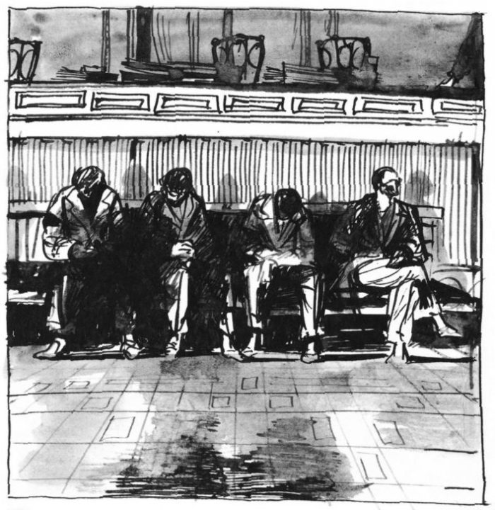This drawing is a diary entry by artist Vladimír Fuka from 21 July 1952, with a simple caption: “Show Trials”.